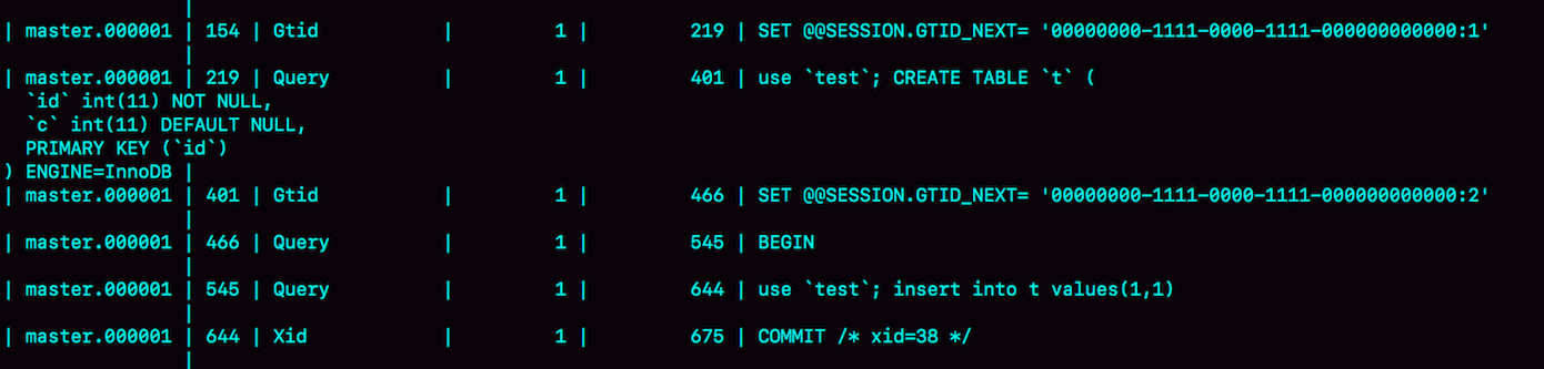 可以看到,事务的 BEGIN 之前有一条 SET @@SESSION.GTID_NEXT 命令。这时,如果实例 X 有从库,那么将 CREATE TABLE 和 insert 语句的 binlog 同步过去执行的话,执行事务之前就会先执行这两个 SET 命令, 这样被加入从库的 GTID 集合的,就是图中的这两个 GTID。