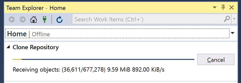 Team Explorer - Homebefore clone starts rather than after it finishesMake sure this UI is visible when cloning: