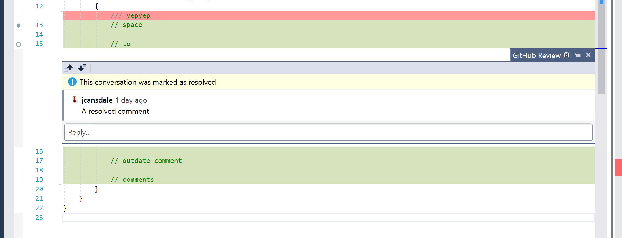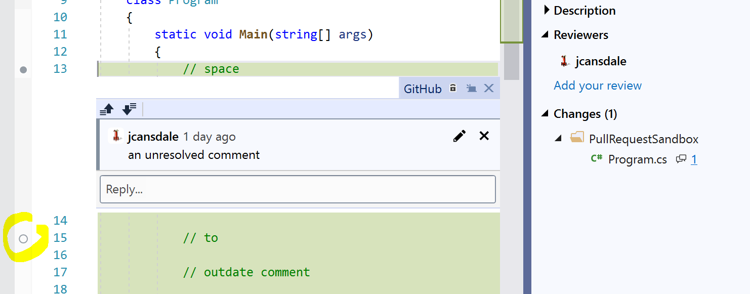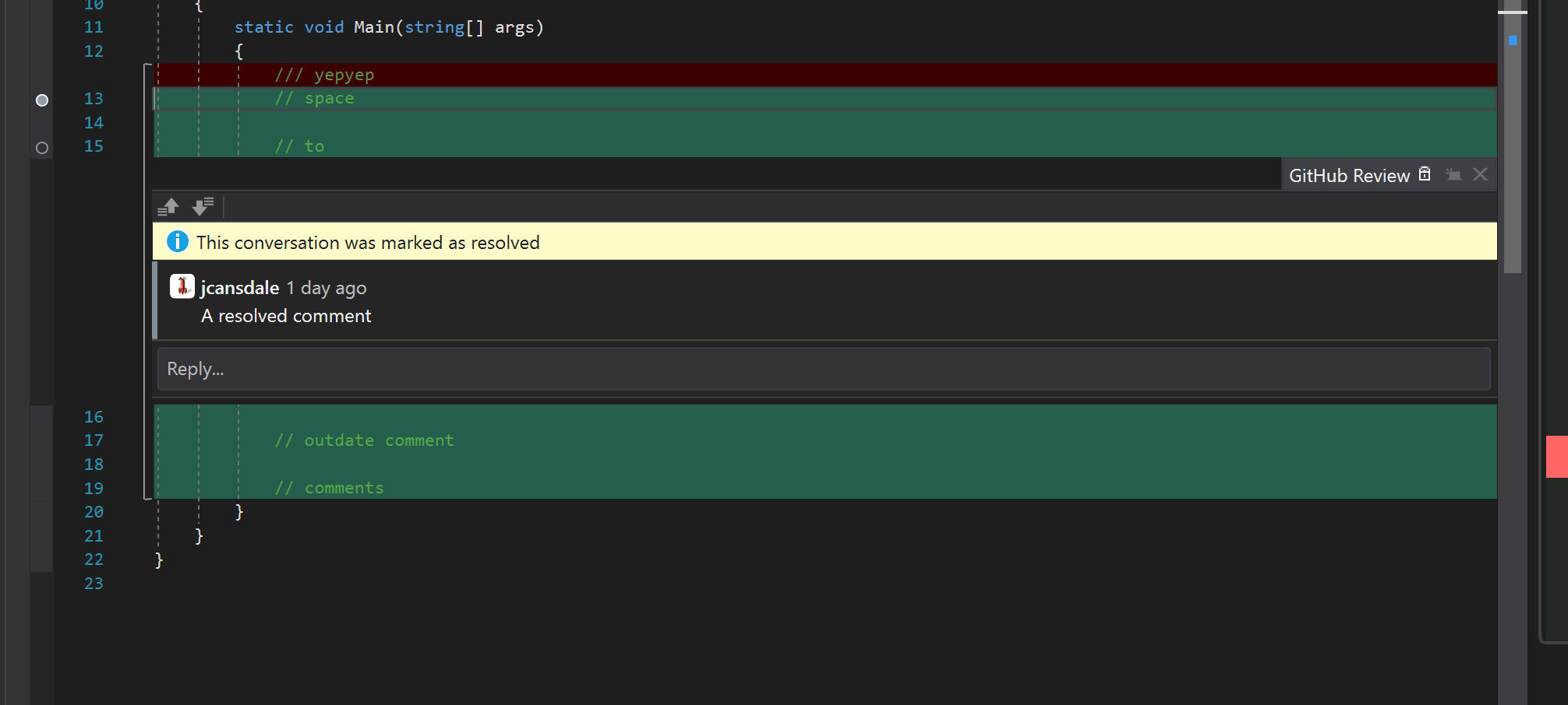 https://github.com/grokys/PullRequestSandboxin Visual StudioGitHubpaneProgram.cs💬 1commentProgram.csappears in diff view and comment is visibleThe conversation was marked as resolvedbanner appears above commentNotes
