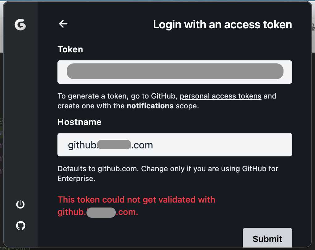 <img width="510" alt="스크린샷 2021-05-31 오후 2 22 03" src="https://user-images.githubusercontent.com/35264628/120143792-c3cf9980-c21b-11eb-9131-464d3dfd476e.png"> ## Setup: - MacBook Air 2020 (M1) - macOS Big Sur 11.4 - Gitify v4.2.1 and v4.2.0 - Github Enterprise Server (not cloud) ## Describe the issue: When register new personal access token to gitify, Gitify always print messages like above. Also I tested to Github Cloud, it works well.
