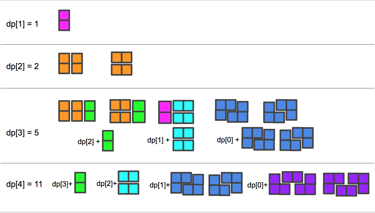 当 N=4 时,那么就是一个 4x2 大小的棋盘,共用十一种放置方法,太多了就不一一画出来了,但是其也是由之前的情况组合而成的。首先是 N=3 的所有情况后面加上一个竖着多米诺骨牌,然后是 N=2 的所有情况加上两个平行的横向的多米诺骨牌,然后 N=1 再加上两种三格骨牌对角摆开的情况,然后 N=0(空集)再加上两种三格骨牌和一个横向多米诺骨牌组成的情况。