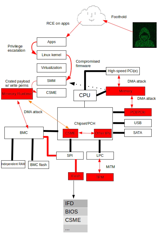 You may have good security software, such as firewall, IDS, IPS, etc. Linux kernel enhancement, such as SELinux, AppArmor. Or even advanced Linux kernel vaccine like Grsecurity, VED from HardenedVault, or AKO from Hitachi...try to imagine, what if the attacker has the root privilege of the firmware like OpenBMC?