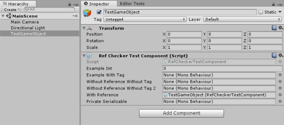 Then open the UnityRefChecker Window and run commands. The RefCheckerTestComponent has the expected results as comments.