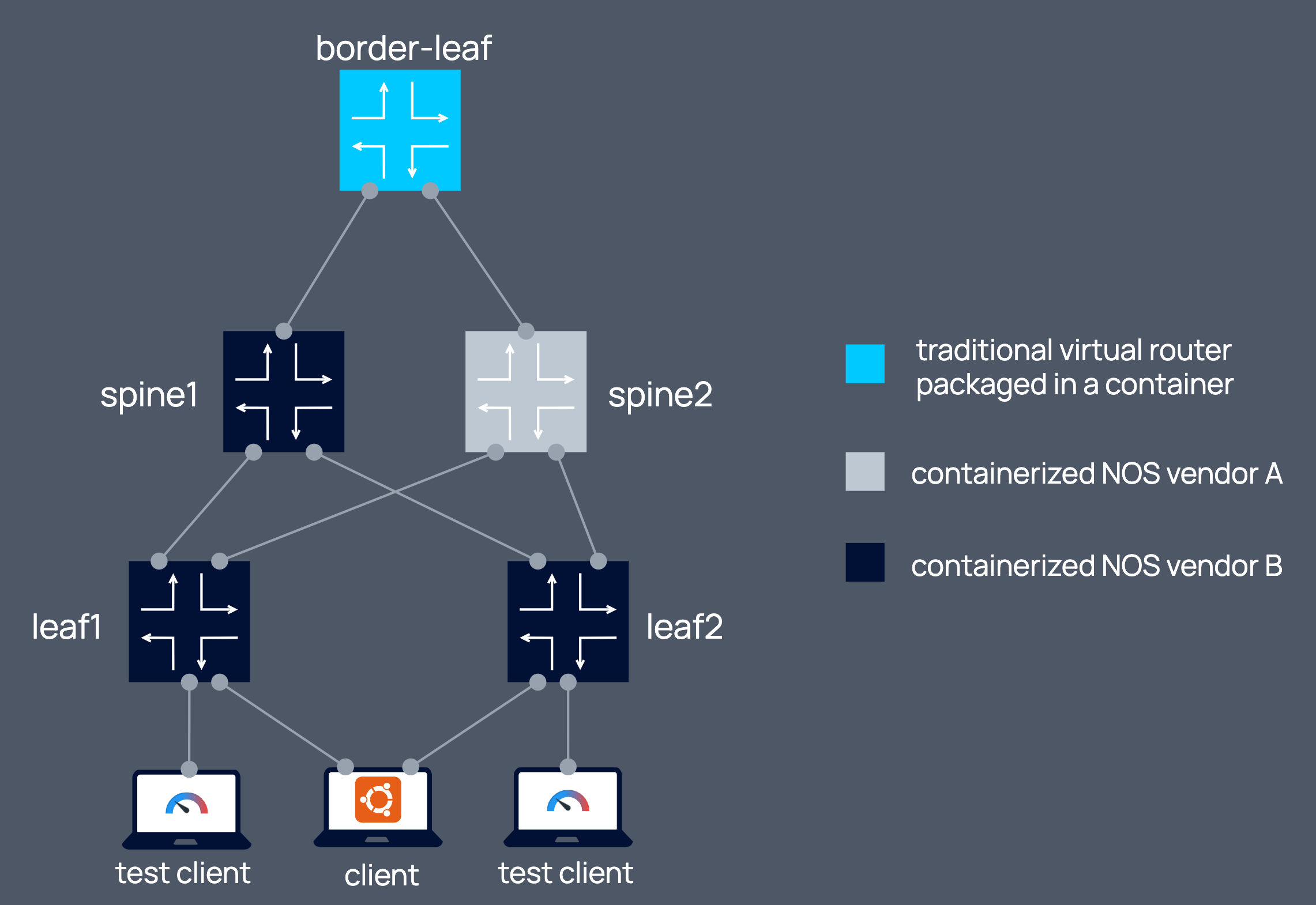 Focus on containerized Network Operating Systems. The sophisticated startup requirements of various NOS containers are abstracted with kinds which allows the user to focus on the use cases, rather than infrastructure hurdles. - VM based nodes friendly