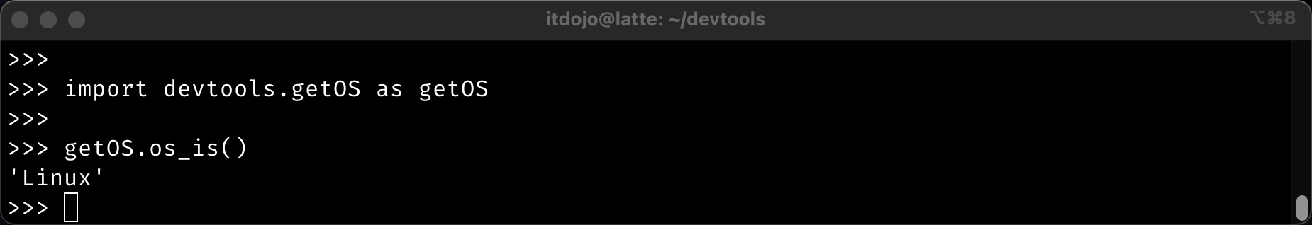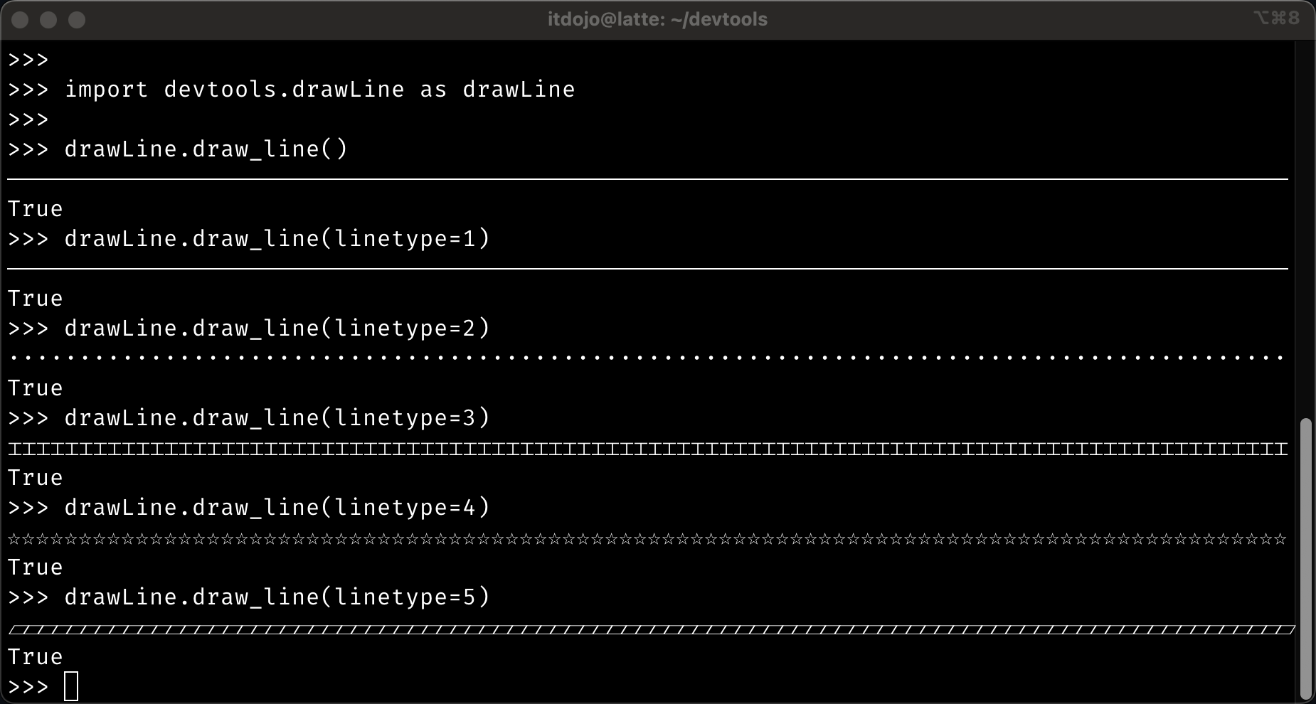 drawLine.draw_line(linetype=1)Returns the OS the script is running on (Windows, MacOS, Linux). I use it to determine if my script can continue (Example: if my script will only run on Linux). getOS only returns the generic OS name ("Windows", "Linux", "Darwin" (MacOS), etc.), it's up to you to do decide what to do with that info in your script.