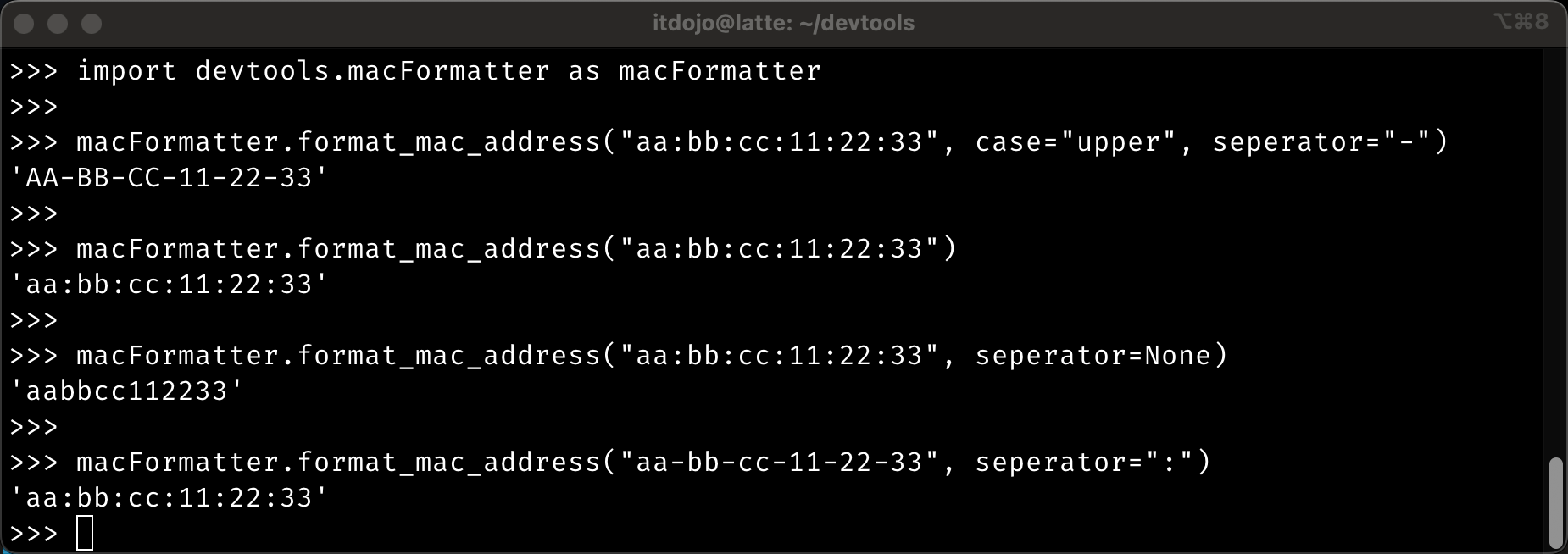 getOS.os_is()Returns a MAC address in the format you desire, regardless of the input format you feed it. If you give it aa-bb-cc-dd-ee-ff it can return aa:bb:cc:dd:ee:ff or aabbccddeeff or aa.bb.cc.dd.ee.ff, etc. It can also toggle case if desired.