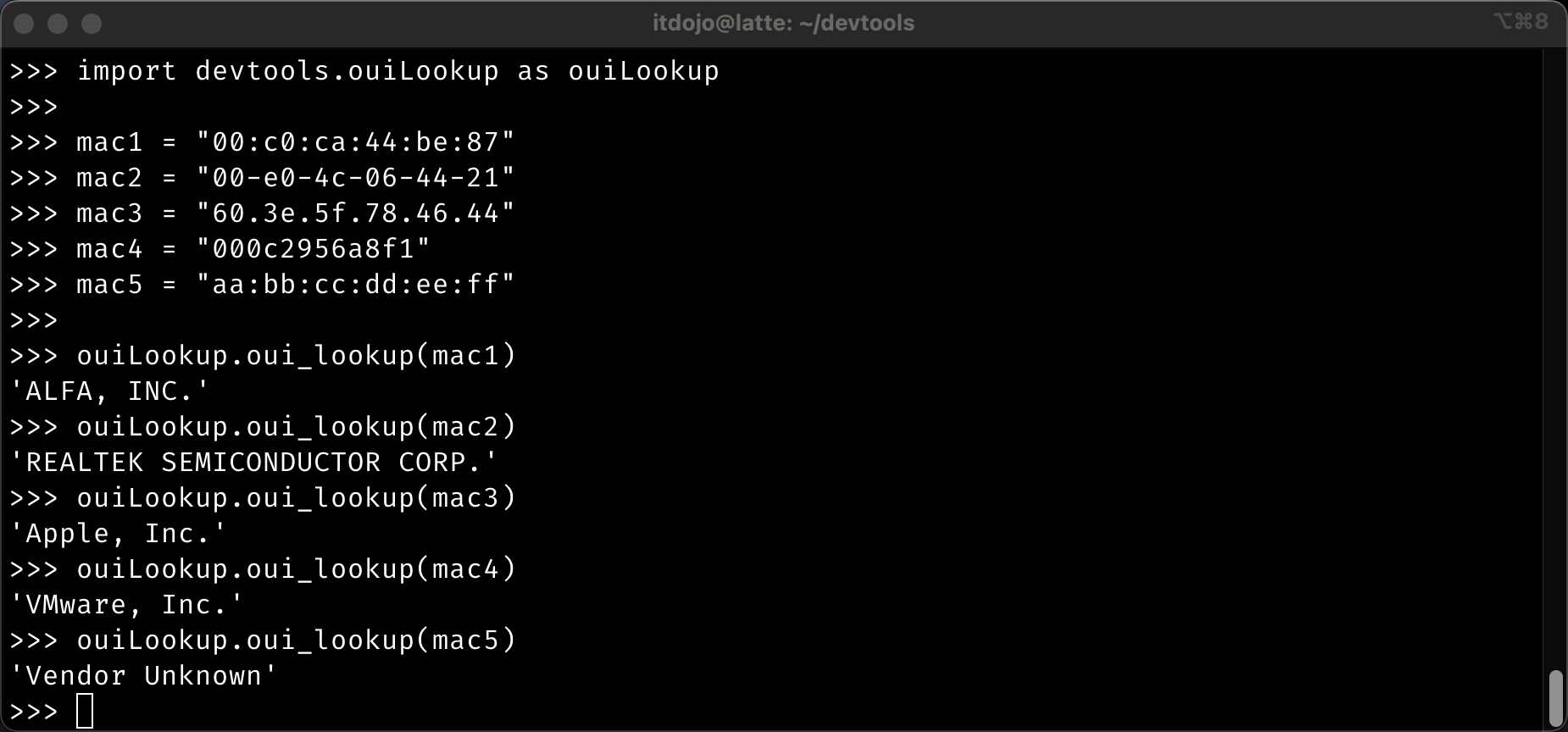 drawLine- Draws a line separator across the screen matching the width of your terminal. There are several line separator styles.getOS- Returns the OS the script is running on (Windows, MacOS, Linux). I use it to determine if my script can continue (Example: if my script will only run on Linux). getOS only returns the OS, it's up to you to do decide what to do with that info in your script.macFormatter- Returns a MAC address in the format you desire, regardless of the input format. If you give it aa-bb-cc-dd-ee-ff it can return aa:bb:cc:dd:ee:ff or aabbccddeeff or aa.bb.cc.dd.ee.ff, etc. It can also toggle case if that matters. This is very helpful for cleaning up MAC addresses to be in the right format for your scripts.ouiLookup- Given a MAC address it will use the IEEE oui.txt file to look up the name of the vendor. If oui.txt is not available in the local directory, the module will download it from the Internet. This may cause a delay the first time it is used. Subsequent lookups are fast. If desired, you can pre-download the oui.txt file from the IEEE usingwget http://standards-oui.ieee.org/oui/oui.txt.rootCheck- Checks to see if the script is running as root. If not root, it will exit the script you are running (so don't use this if you script does not need to be root).shellCommand- Provide a command as a string (Ex. "ip link set {iface} down") to this module and it execute the command and return the result (STDOUT and STDERR).wifiSelector- This tool only works on Linux and retrieves all wlan interfaces on the system. It also has a function to create a list of the available interfaces to the user. Optionally, it will also show the interface MAC address and OUI vendor name.networkCommands- A list of funtions that return shell scripting command strings. The idea is to simplify the syntax and readability of your scripts and eliminte the need to constantly add string variables to your scripts for commands you need to run.