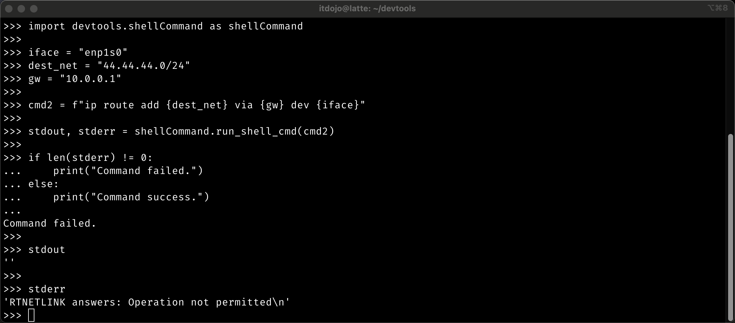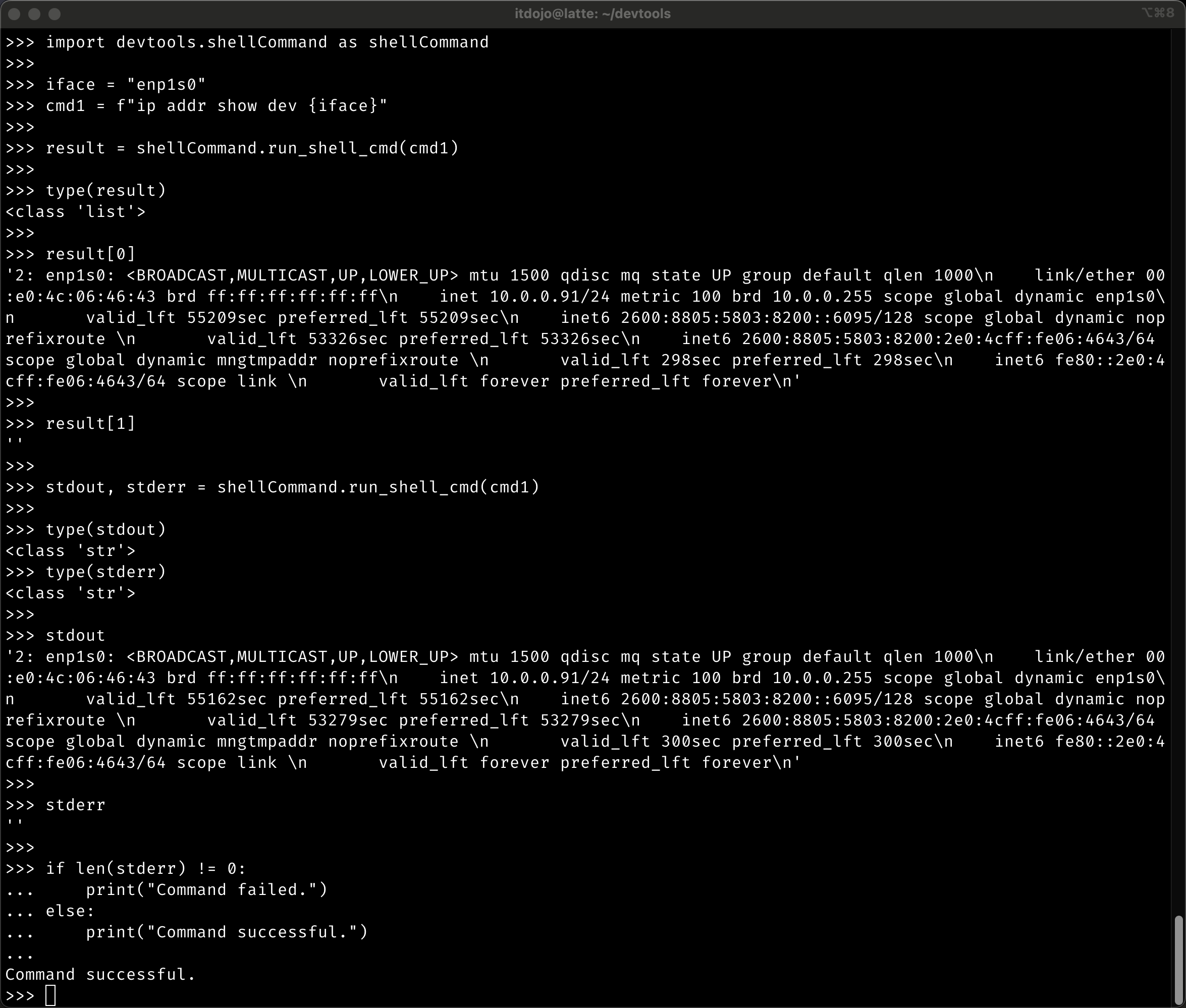 The run_shell_cmd(cmd) function return a list with two items. Item 0 is the result of STDOUT and item 1 is the result of STDERR. If there was no error, STDERR will be '' and and have a length of 0. If there was an error, STDOUT will be '' and have a length of 0.