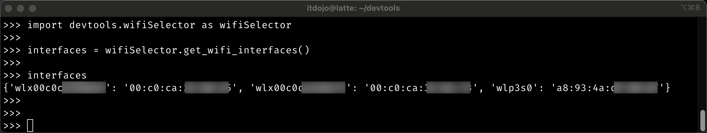 get_wlan_interfaces()- Returns all available wlan interfaces as a dictionary object with the key:value pairs in the form of 'interface':'mac_address'.- Example: {'wlx00c0ca73bd44': '00:c0:ca:73:bd:44', 'wlx00c0ca448873': '00:c0:ca:44:88:73', 'wlp3s0': 'a8:93:4a:ac:60:44'}