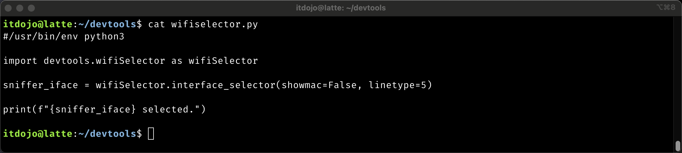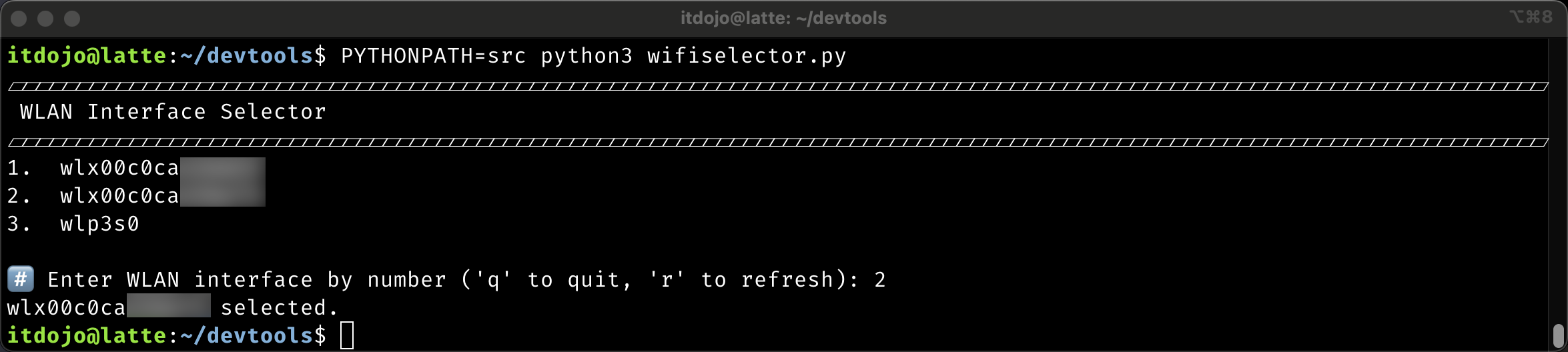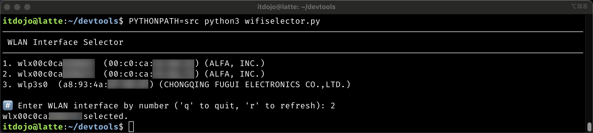 interface_selector(showmac=True, linetype=1)- Generates a numbered list of wlan interfaces for the user to select from.- If your script needs to interact with the user to have them select a wlan interface for whatever you are doing, use