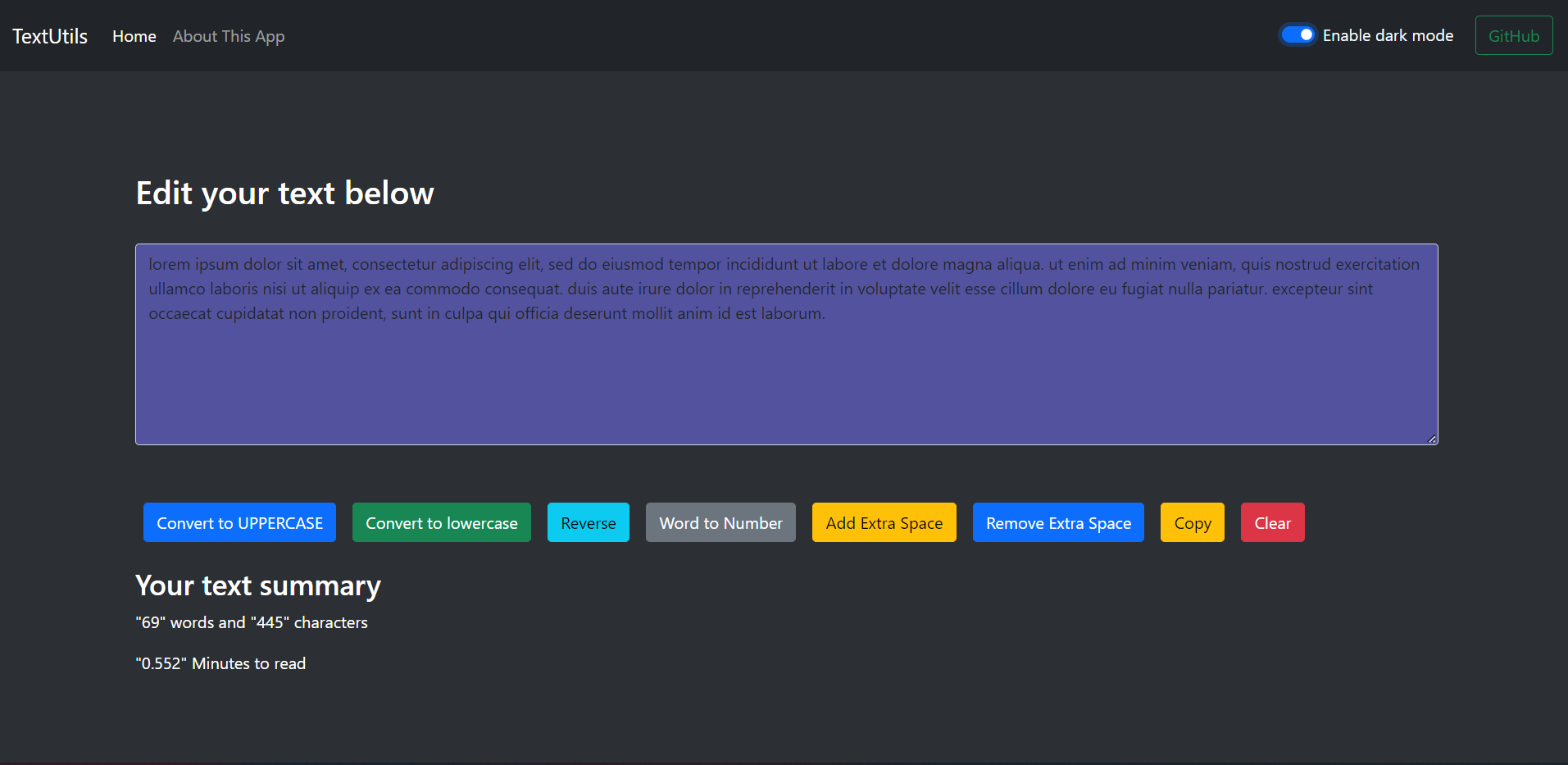 TextUtils is an amazing cool online web based text editor made with react.JS