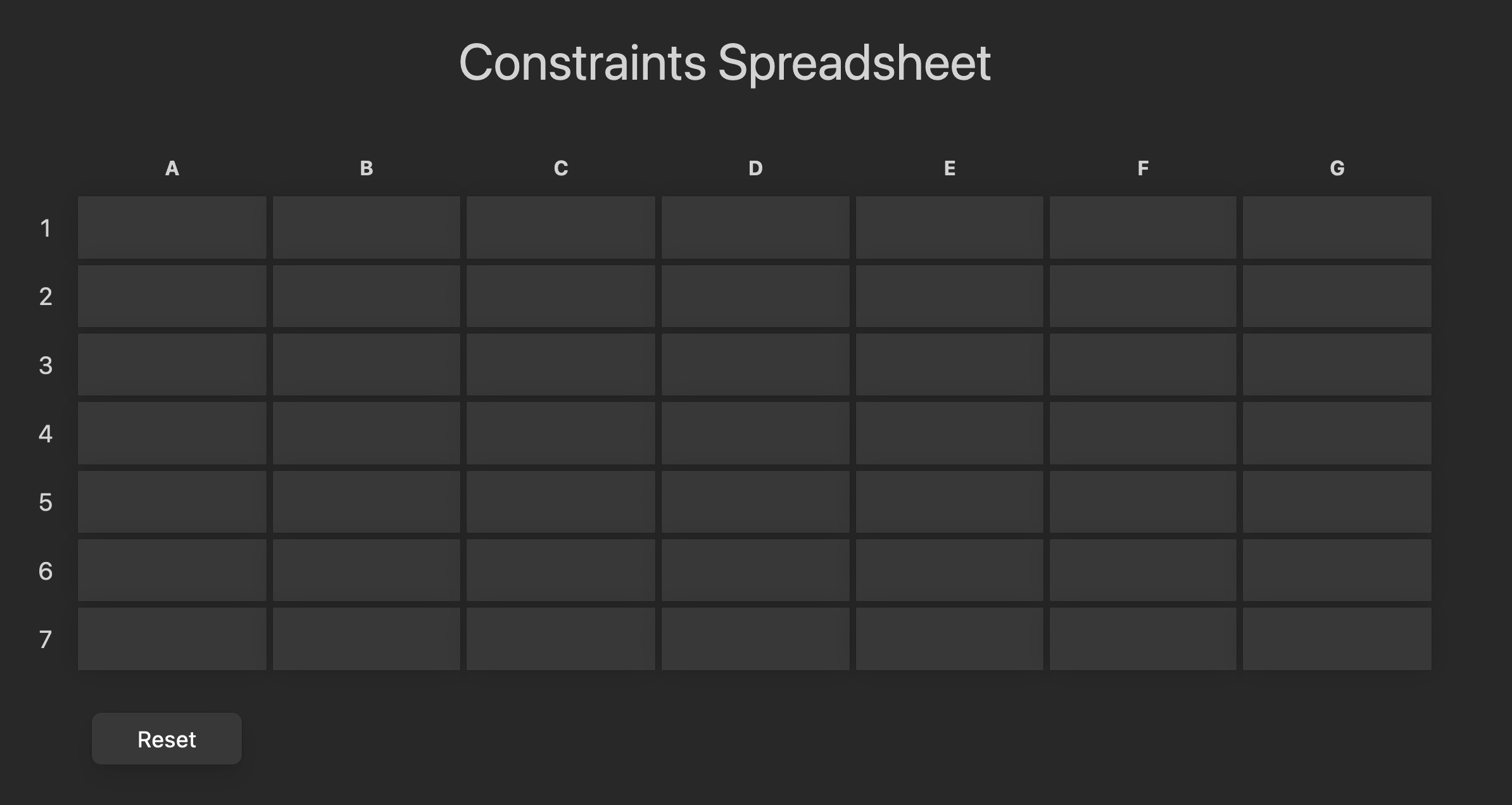 In order to use the spreadsheet and test the constraints, you want to type values into at least two cells and then set a formula for the two cells in another cell. For example, you can: