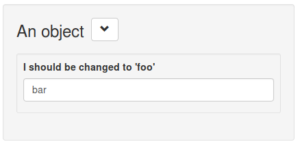 { "title": "An object", "type": "object", "properties": { "fieldOne": { "title": "I should be changed to 'foo'", "type": "string", "default": "bar" }, "depender": { "title": "I depend on fieldOne to be 'foo'", "type": "string", "options": { "dependencies": { "fieldOne": "foo" } } } } }And the output it produces (bootstrap 3 theme)