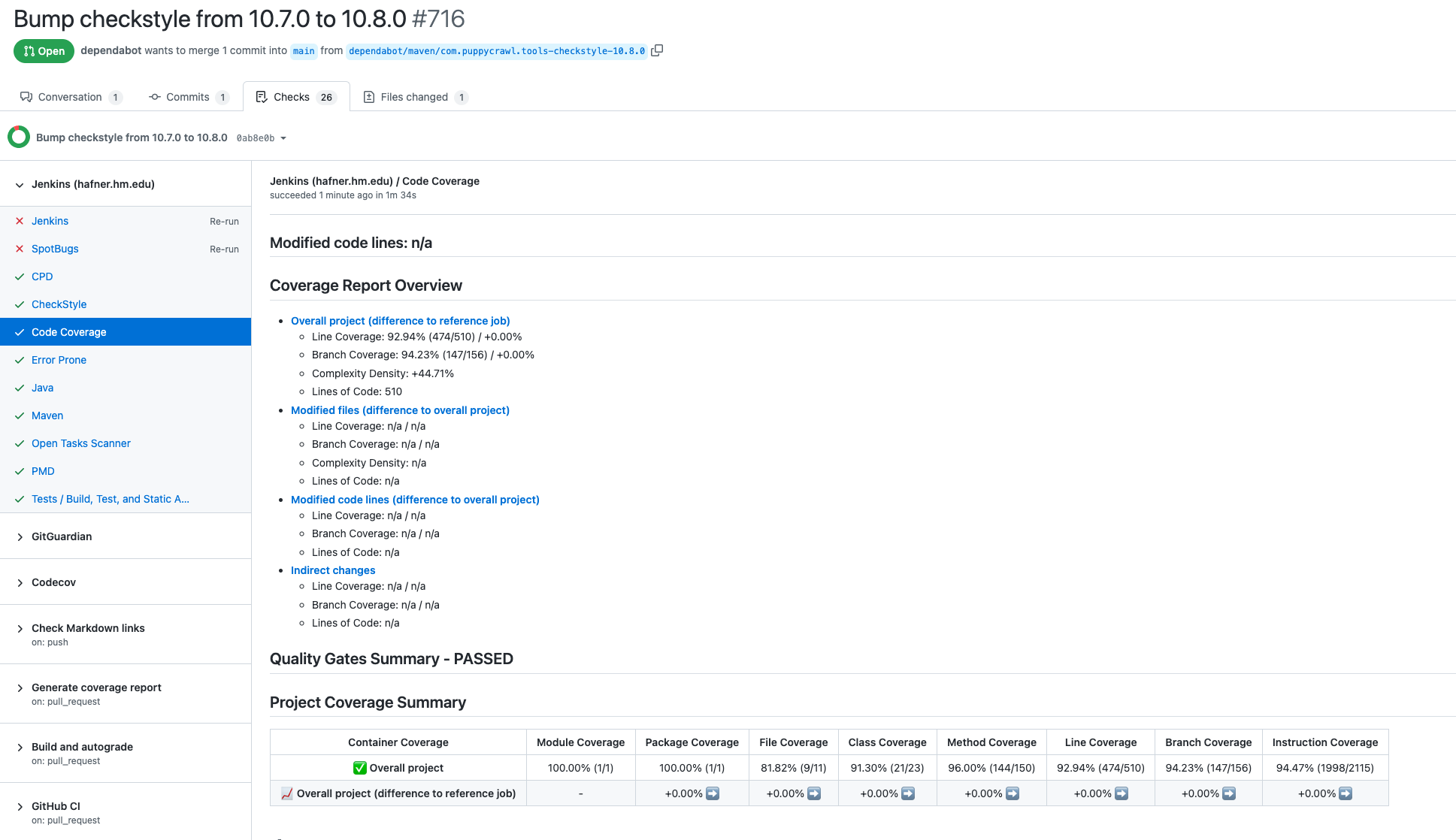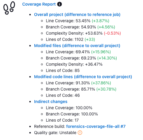 Regarding the delta changed lines: I guess we should compare only against the modified files coverage. The whole project has modules with higher and with lower coverage. When we compare the changes of a module with lower coverage against the whole project, there will be a negative trend, even if the modified files are covered quiet good compared to the rest of their module. Therefore, comparing against the changed files would keep the context hence it more accurate, in my opinion.