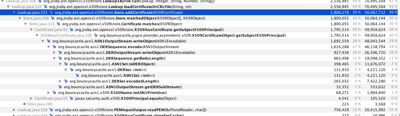 Memory profiler shows that under Lookup.loadCertificateOrCRLFile method, JRuby 9.0.0.0 doesn't allocate many objects but 9.0.5.0 allocates many objects at Store.addCertificate in addition to regular allocation at PEMInputOutput.readPEM: