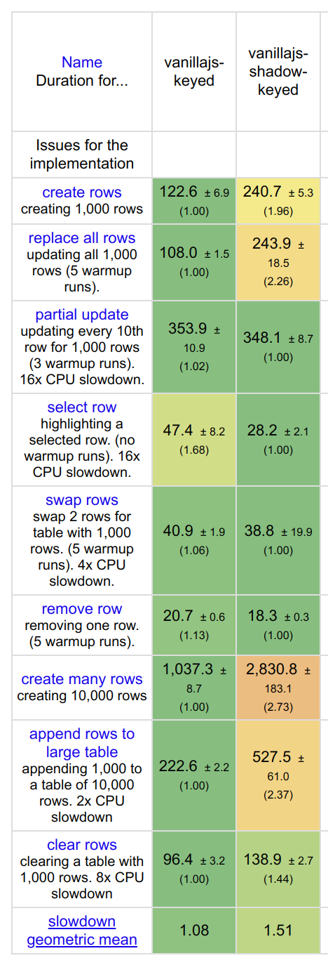 Other good or popular benchmarks: Demos The one thing they always have in common is non-modular CSS and more often than not for measuring purposes specific DOM structures. I do think the CSS can be worked through in a lot of the demos. Tables are particularly nasty and other benchmarks don't necessarily use those. And we've started to see WebComponent specific benchmarks(https://github.com/vogloblinsky/web-components-benchmark, or https://webcomponents.dev/blog/all-the-ways-to-make-a-web-component/). But it definitely highlights why you don't see even webcomponent libraries like Stencil or LitElement use the Shadow DOM in these demos. I was talking to @trusktr recently about the desire to take a fork of JS Framework Benchmark in this direction, and I admitted I probably wouldn't have time but I think there would definitely be an interest there. Most webcomponent benchmarks are simplistic based on creation time or things like size. I will say from having participated in a few there are some standardization considerations. Some libraries using passed handlers versus DOM events to communicate upwards makes a pretty decent performance difference. But that's the whole thing. Maybe I've witnessed this, but this kind of data isn't out there for general consumption. I'm positive there is an interest. |