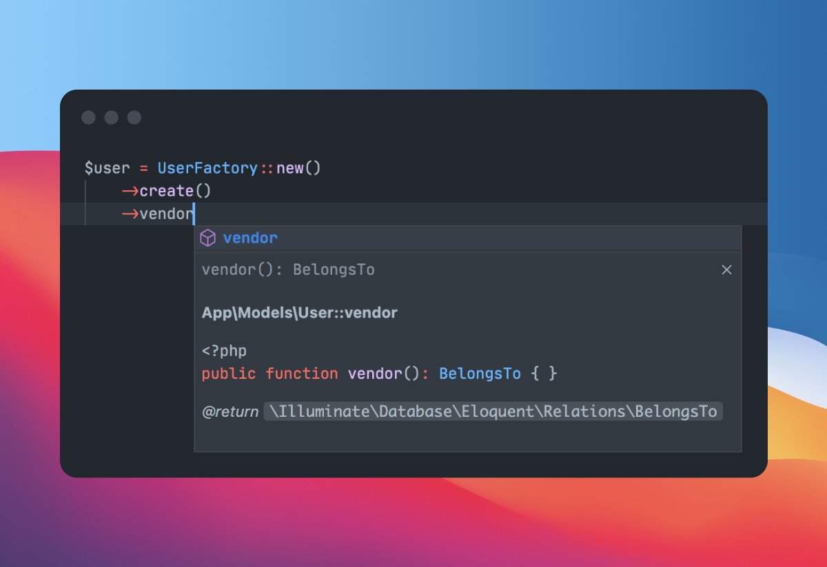 This is entirely the work of @lepikhinb as posted in https://forum.archte.ch/laravel/t/factory-autocompletion