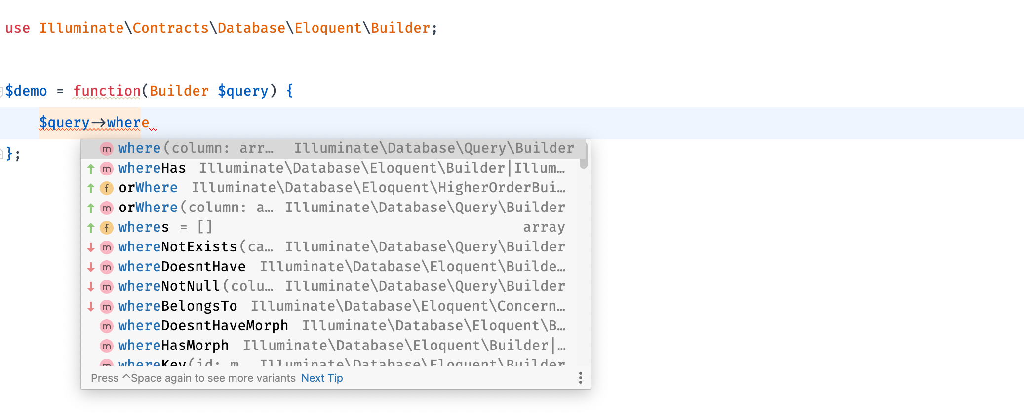 @mixinannotations. I've also added two contracts to address the differences between Eloquent queries and base queries.As a result, you can do the following: