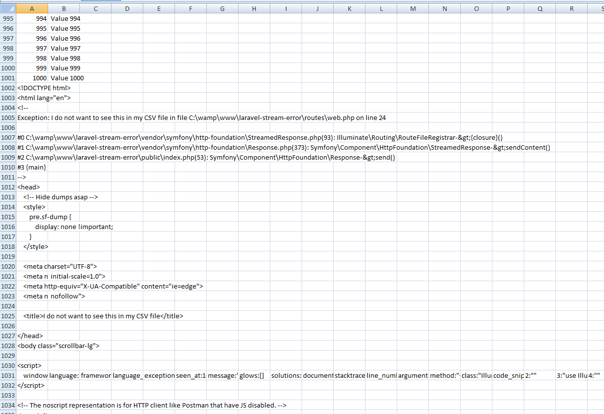routes/web.phpfile:When you visit that route, it'll download the CSV file. Open it, and you'll see the HTML of the message directly in the file: