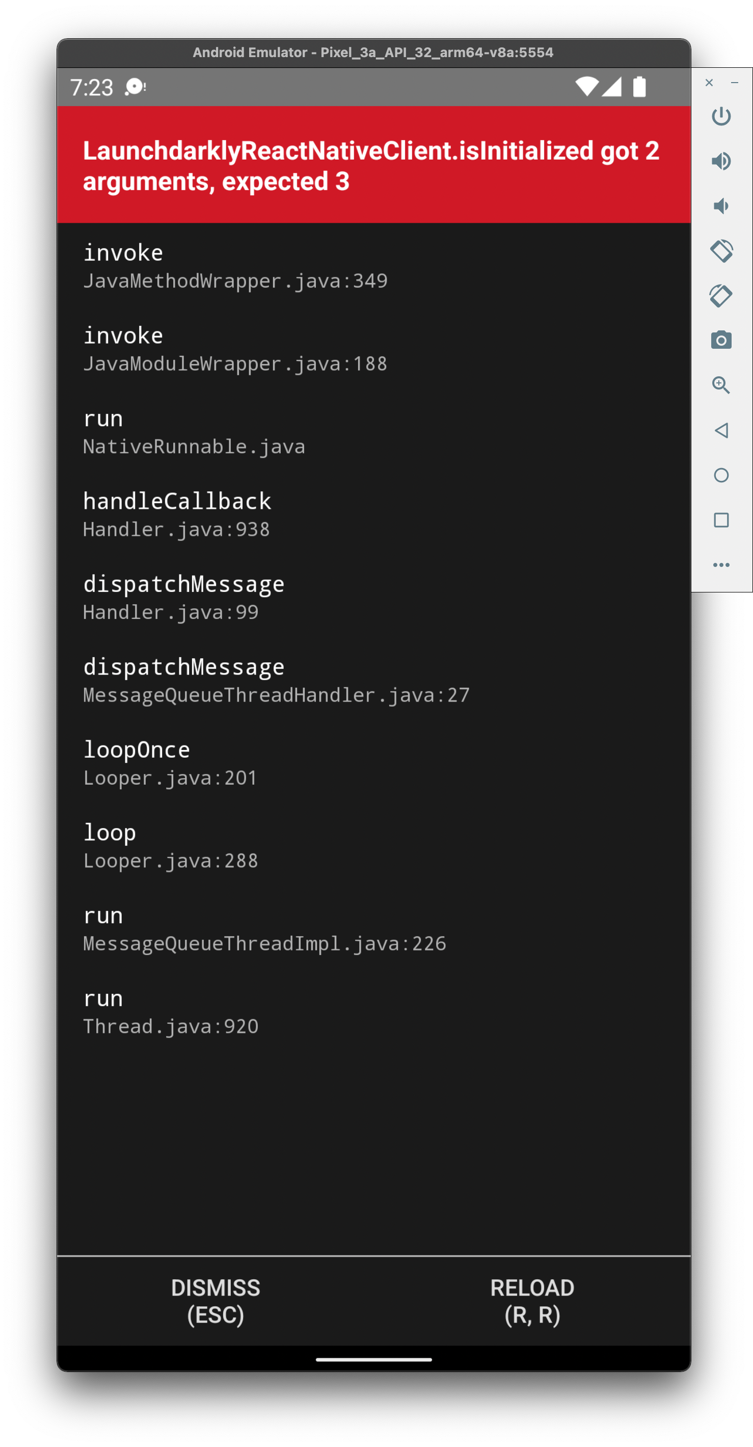 Error Message on Android Android: LaunchdarklyReactNativeClient.isInitialized got 2 arguments, expected 3.