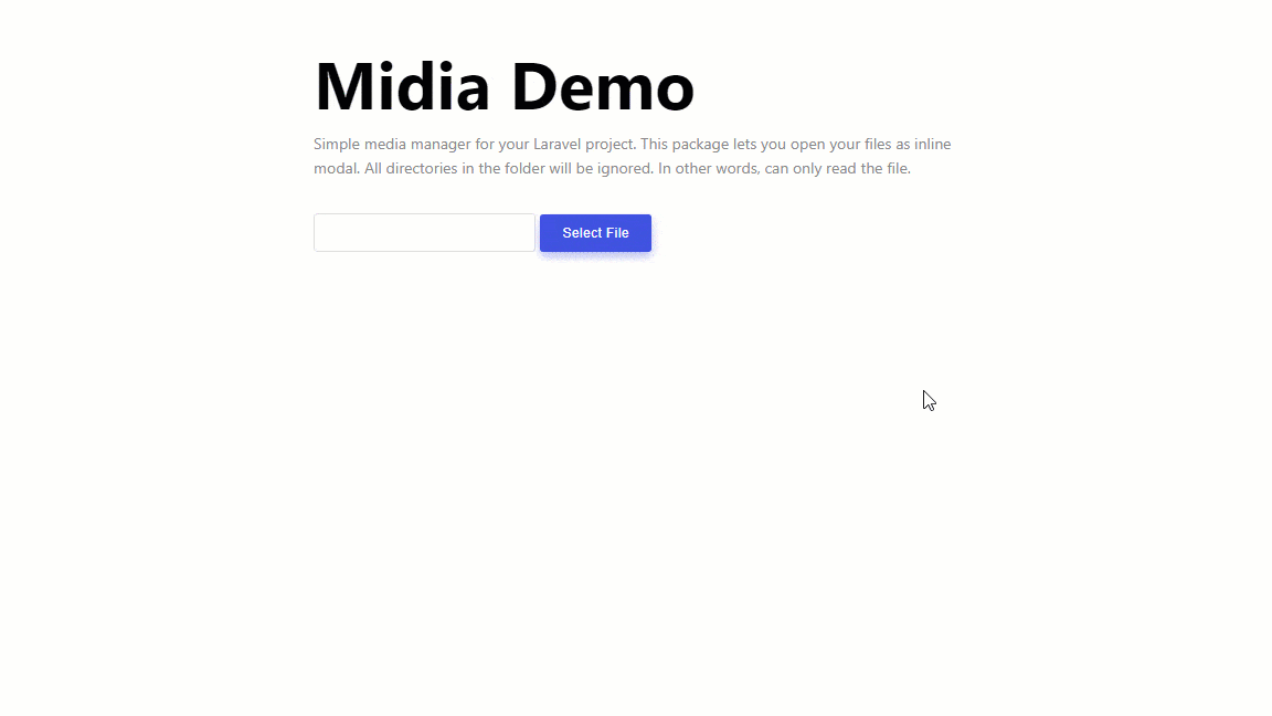 Simple media manager for your Laravel project. This package lets you open your files as inline modal. All directories in the folder will be ignored. In other words, can only read the file.