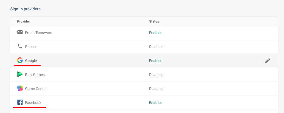 Turn on Google and Facebook Providers inside your Firebase Project: