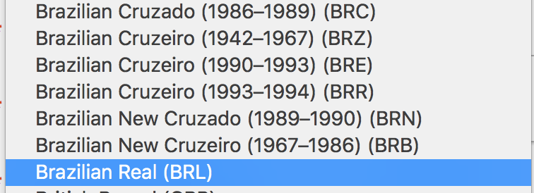We see many unused, deprecated currencies for Brazil above the only valid option.