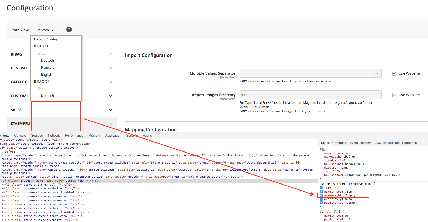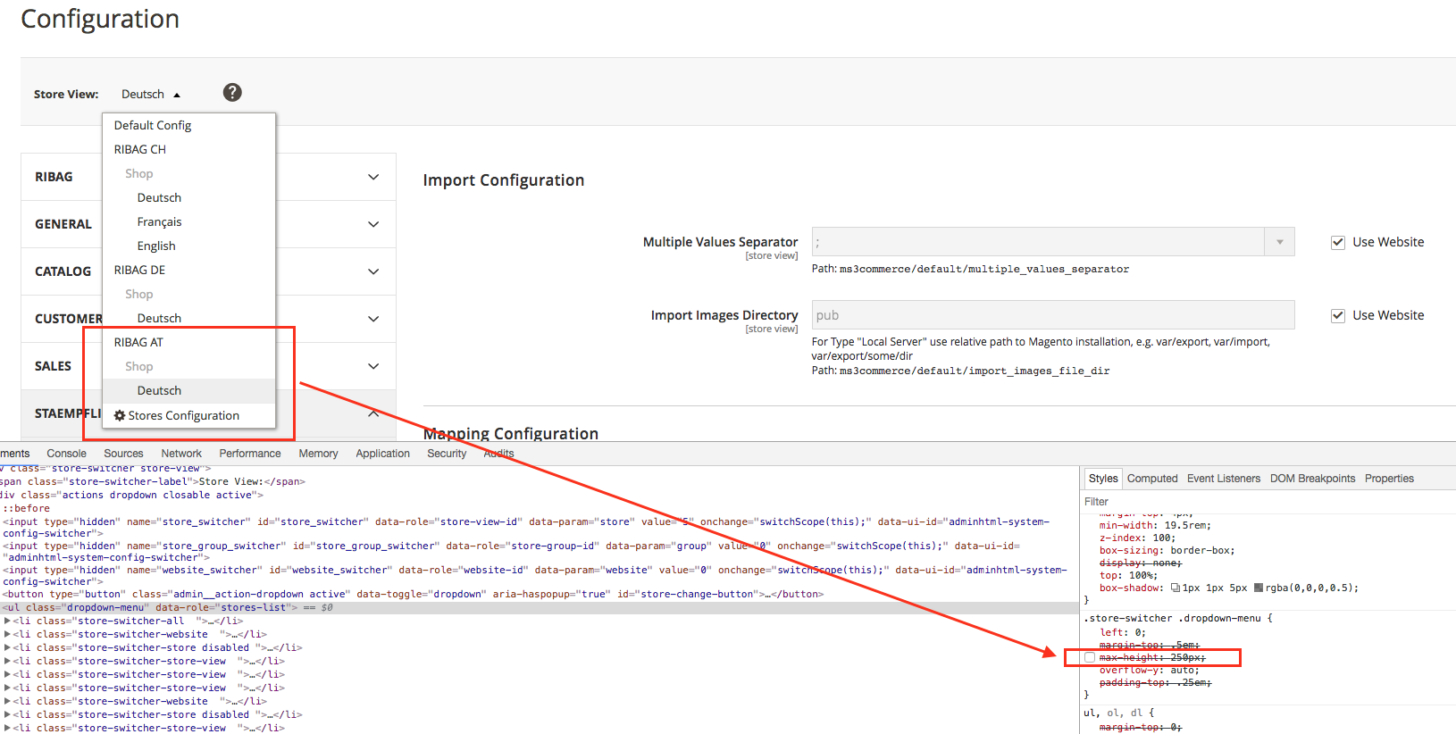 Store view switcher in Admin does not display all stores if the height of them is bigger than 250px. Admin cannot select those stores to edit their configuration