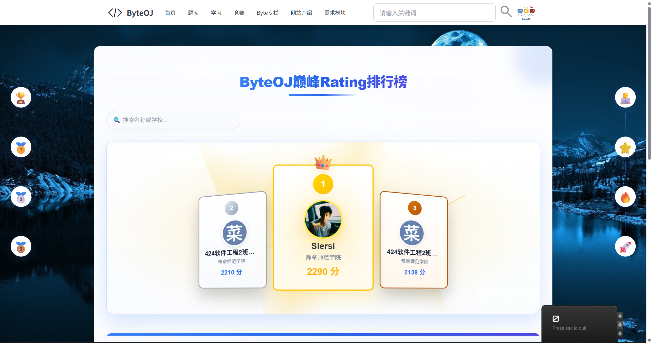 - 天梯分算法计算服务开通成功,使用的是类似于Codeforces的背后算分机制来进行的。(由于人比较少,因此分数变化可能还是蛮大的)