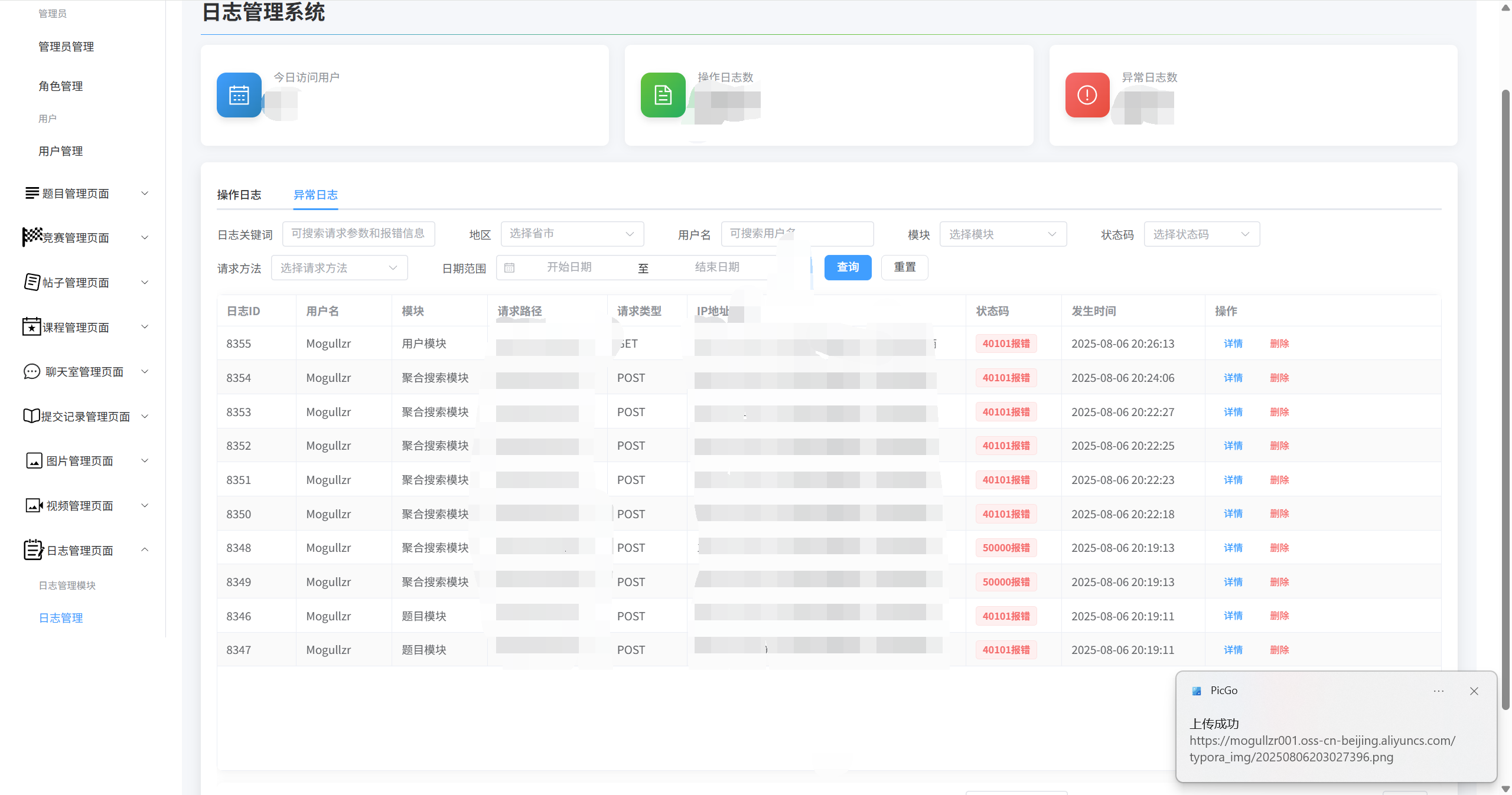 - 日志通过拦截器进行异步拦截请求并且进行记录,分操作日志和异常日志两种,对应着两张表