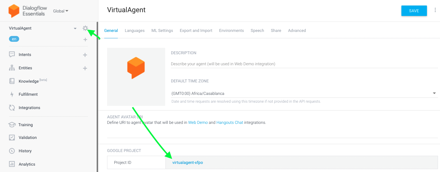 We now have our agent configured with a couple intents so we are ready to move on. We will need a Google service account to access the agent via API. To set this up, navigate to the general agent options by clicking on the cog once again. Make sure you make a note of your project id, as you will need it later.