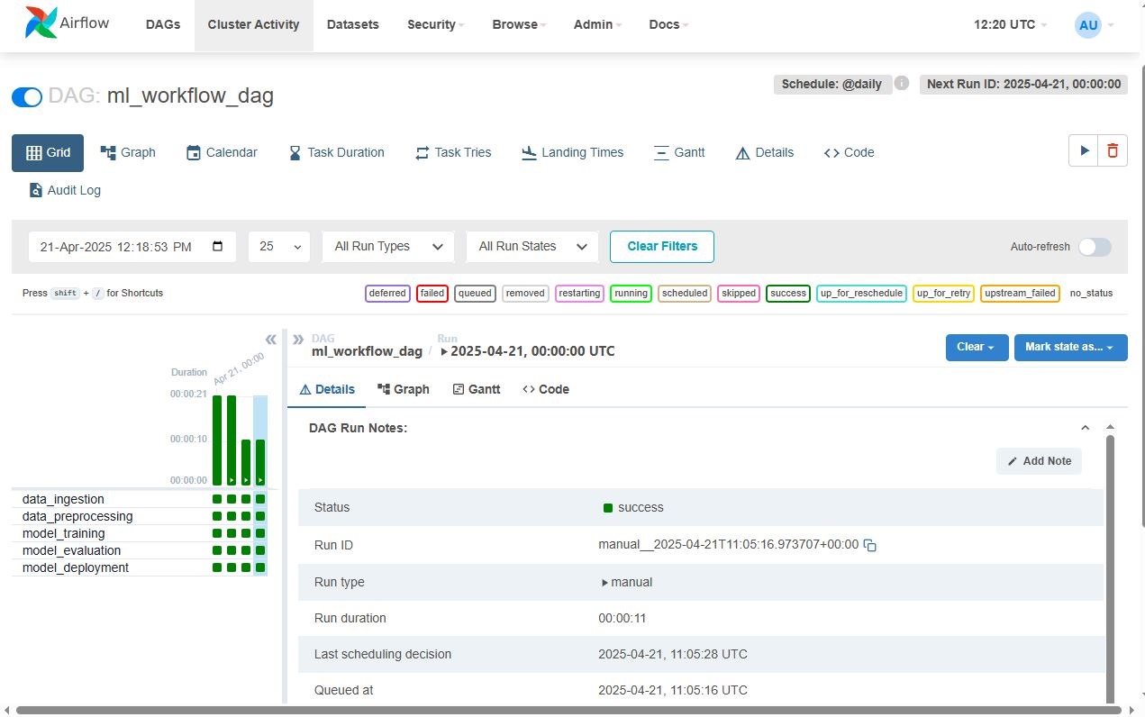 This project sets up Apache Airflow to automate and manage an ML pipeline, covering stages from data ingestion to model deployment. The workflow is designed as a DAG to ensure seamless task execution and monitoring.