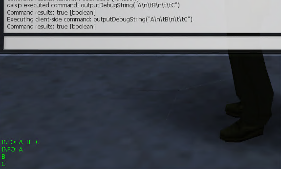 crun outputDebugString("A\n\tB\n\t\tC")