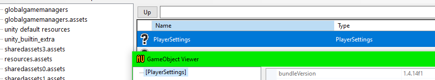 AssetsView is a bit misleading here. The actual asset isn't named, so AssetsView defaults to the same name as the type. GetAssetInfo only looks for the m_Name field if it exists, so it won't help you. GetAssetsOfType is the right way, although it returns an array so you could just do [0] on it instead of a foreach loop. Also, PlayerSettings is notorious for changing often and it's possible that you will have read errors or missing fields if you try to read the PlayerSettings asset (it will probably throw an OutOfMemoryException.) In that case, you may want to use the large classdata.tpk file in the releases. You can also try the new dev branch of AssetsTools.NET which has better versioning support: https://github.com/nesrak1/AssetsTools.NET/tree/upd21-with-inst, but you would need to grab a different kind of tpk from https://nightly.link/AssetRipper/Tpk/workflows/make_tpk/master. The wiki has more info on how to use that new version here: https://github.com/nesrak1/AssetsTools.NET/wiki/Getting-Started:-Assets-file-reading. |