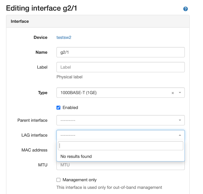 /dcim/interfaces/NNN/edit/?return_url=/dcim/devices/MMM/interfaces/). Set LAG to lag1 - Using the same method: edit interface g2/1, try to set LAG to lag1
