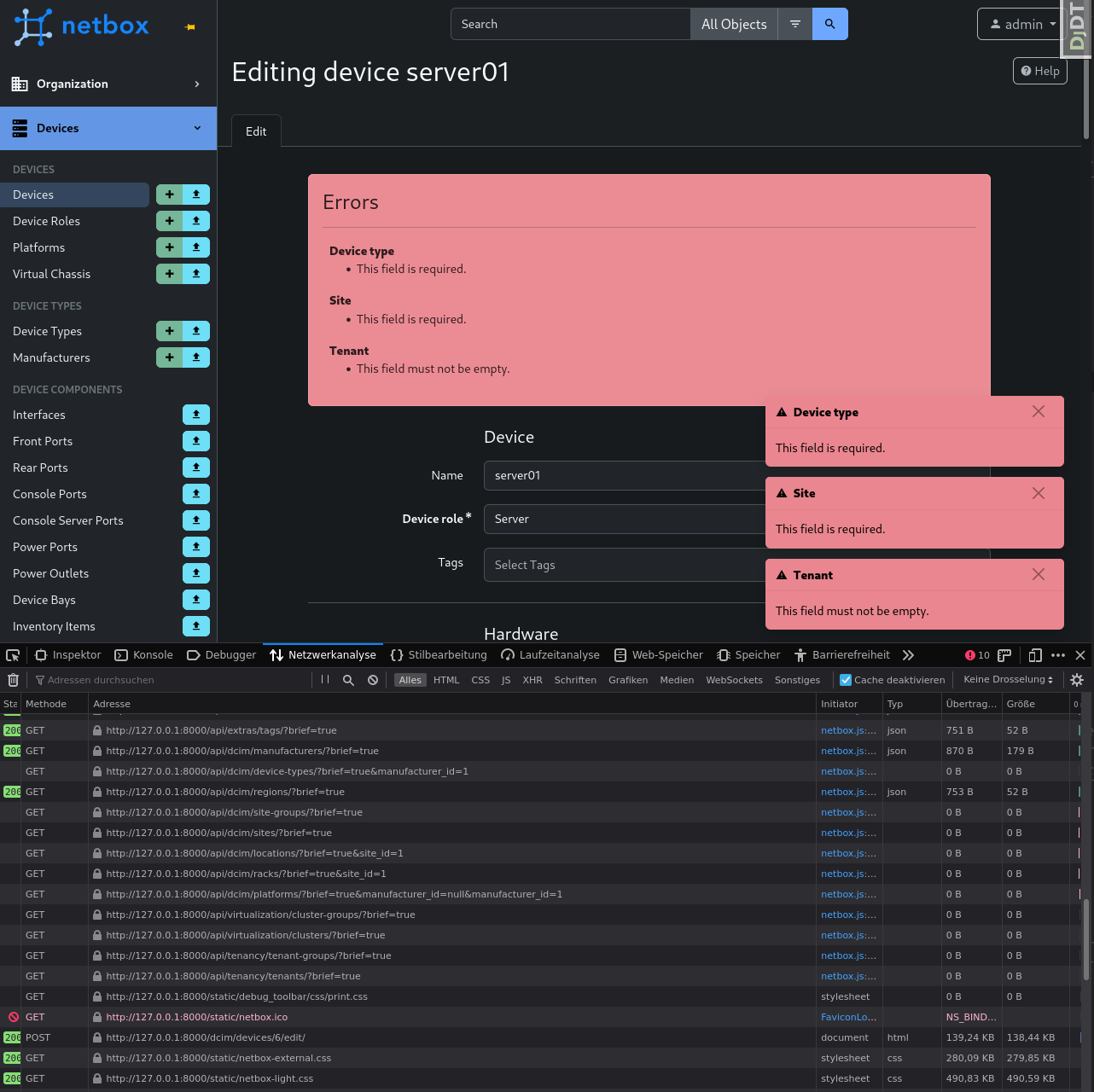 - Inspect error messages, that tell you, you should choose a Site, Device-Type and Device-Role