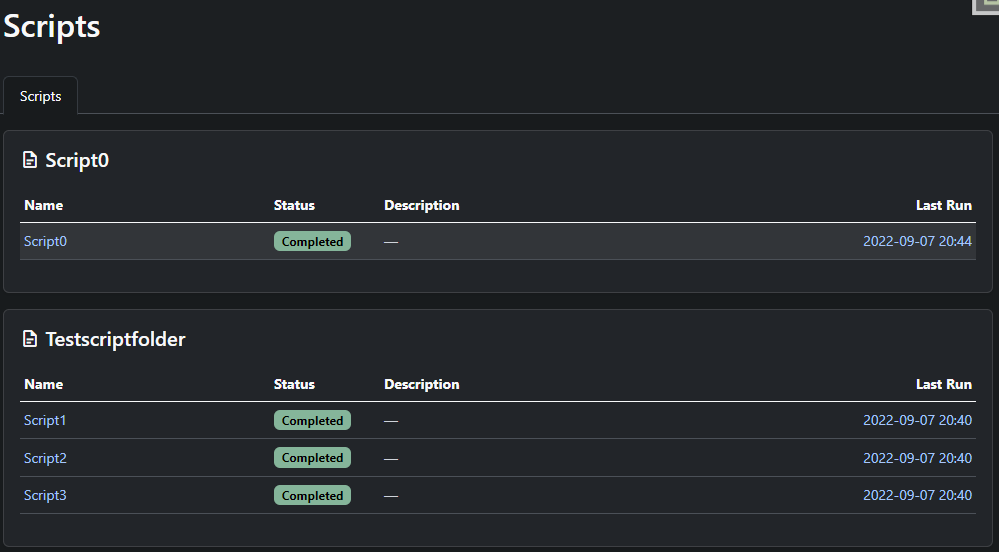 testscriptfolder.testnestedfolder.script3which would be split to:The advantage is that scripts become much easier to manage as before the only way to have scripts grouped under the same module was to have them all in the same file. With long scripts this instantly becomes unwieldy.