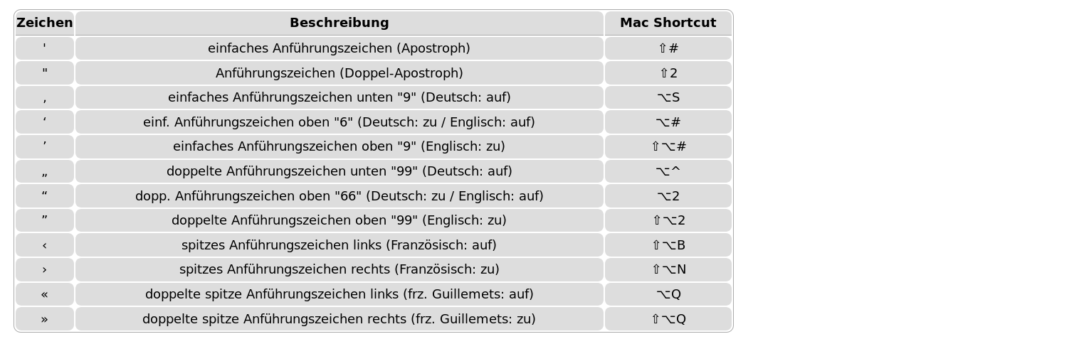 Actually, the problem is that certain characters, easily accessible via the keyboard, are interpreted differently as control code by certain editors (such as Markdown and Asciidoctor). On the other hand, my workaround is to bypass the control code and enter as many characters as possible in the output (all defined by UTF-8 code) via keyboard shortcuts. Because these characters are rarely used as control code, I don't leave the rendering of the characters to the editors. All these characters can be entered directly with any keyboard. Differences in how this can be done are in the keyboard layout used and the operating system of the computer. As the knowledge of how to use this is very basic for many users in the technical professions, I have created a file to help translators/authors to use the typographically correct spelling for the new German repo. However, even for English texts you can quickly define a few basic rules that can prevent an output like this (taken from one file): OK, let me first mention the different dashes and then move on to the quotation marks and describe how to use them correctly. There are three Dashes of different widths. " " " Quotation marks are used very differently in different languages. The following characters are common for English books: The straight quotation mark (single ' or double ") should only be used in sample texts for code. It is better and more correct to use the curved quotation marks. Unicode (UTF-8) defines more than 20 different characters. " " " " |