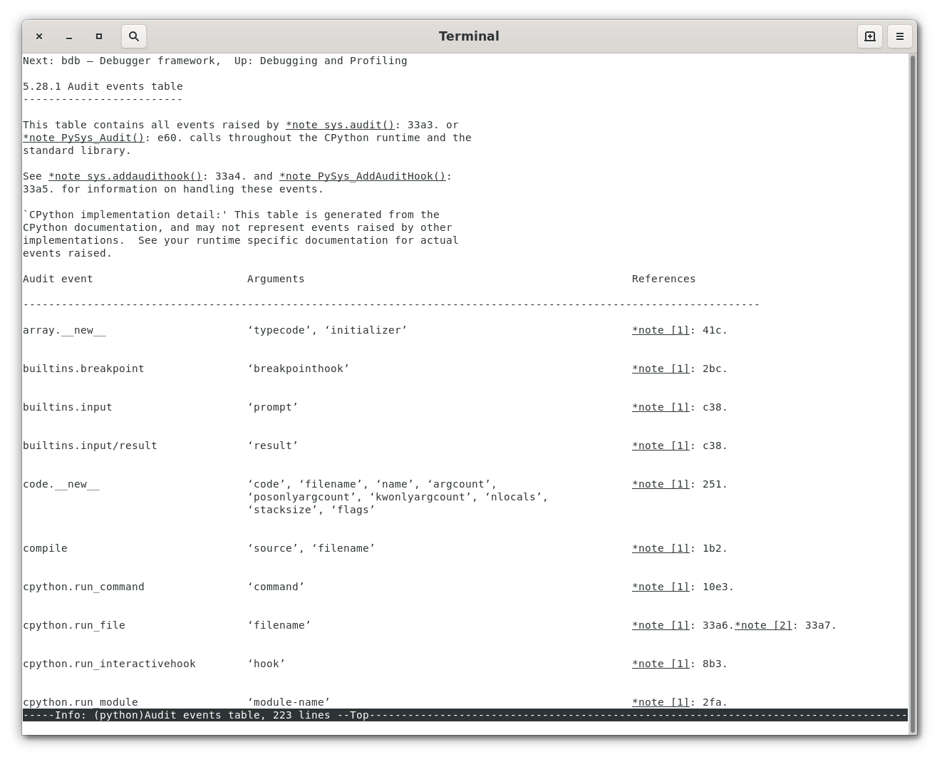 Thanks, I didn't know about texinfo and reading it on Emacs is nice. I am okay with the changes as per the reference and running locally also builds fine. I am not sure about running make texinfo on primary CI like Travis. I would defer to @JulienPalard on that.