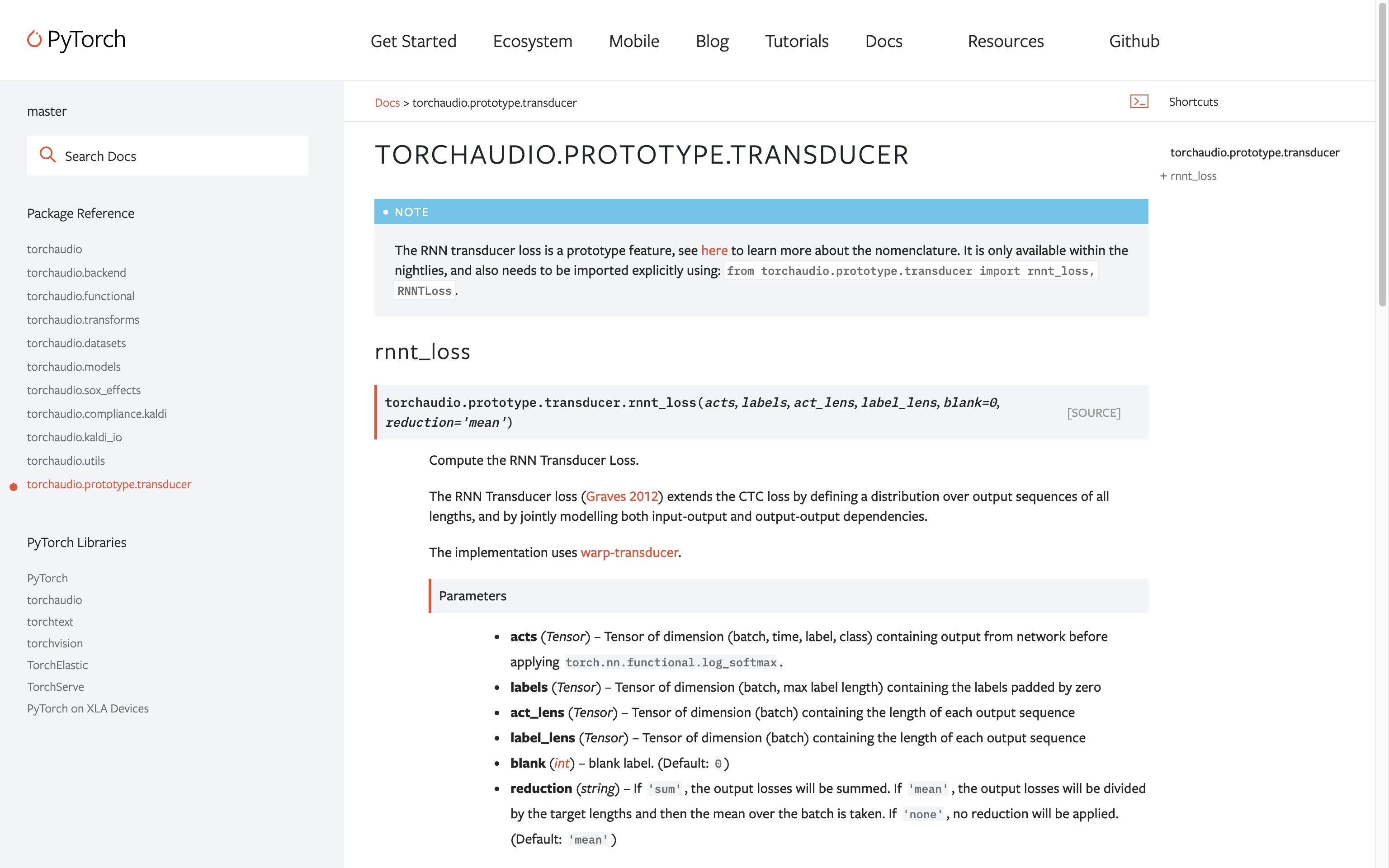 Add prototype RNN transducer loss to the documentation. This will need to be guarded off from releases.