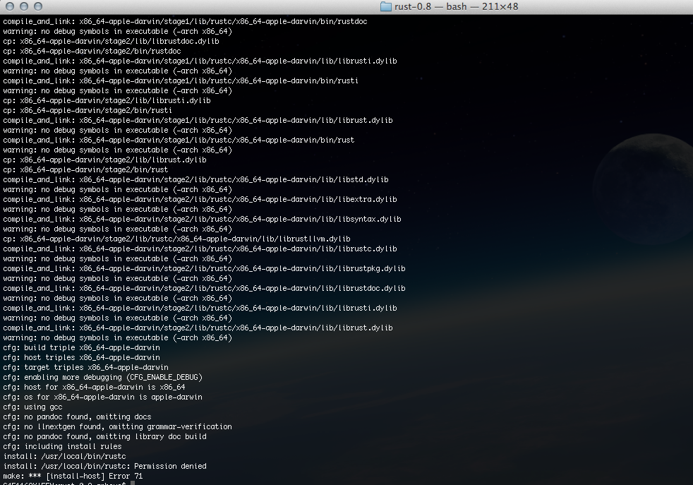 console: warning: no debug symbols in executable (-arch x86_64) cfg: build triple x86_64-apple-darwin cfg: host triples x86_64-apple-darwin cfg: target triples x86_64-apple-darwin cfg: enabling more debugging (CFG_ENABLE_DEBUG) cfg: host for x86_64-apple-darwin is x86_64 cfg: os for x86_64-apple-darwin is apple-darwin cfg: using gcc cfg: no pandoc found, omitting docs cfg: no llnextgen found, omitting grammar-verification cfg: no pandoc found, omitting library doc build cfg: including install rules install: /usr/local/bin/rustc install: /usr/local/bin/rustc: Permission denied make: **\* [install-host] Error 71 Please help