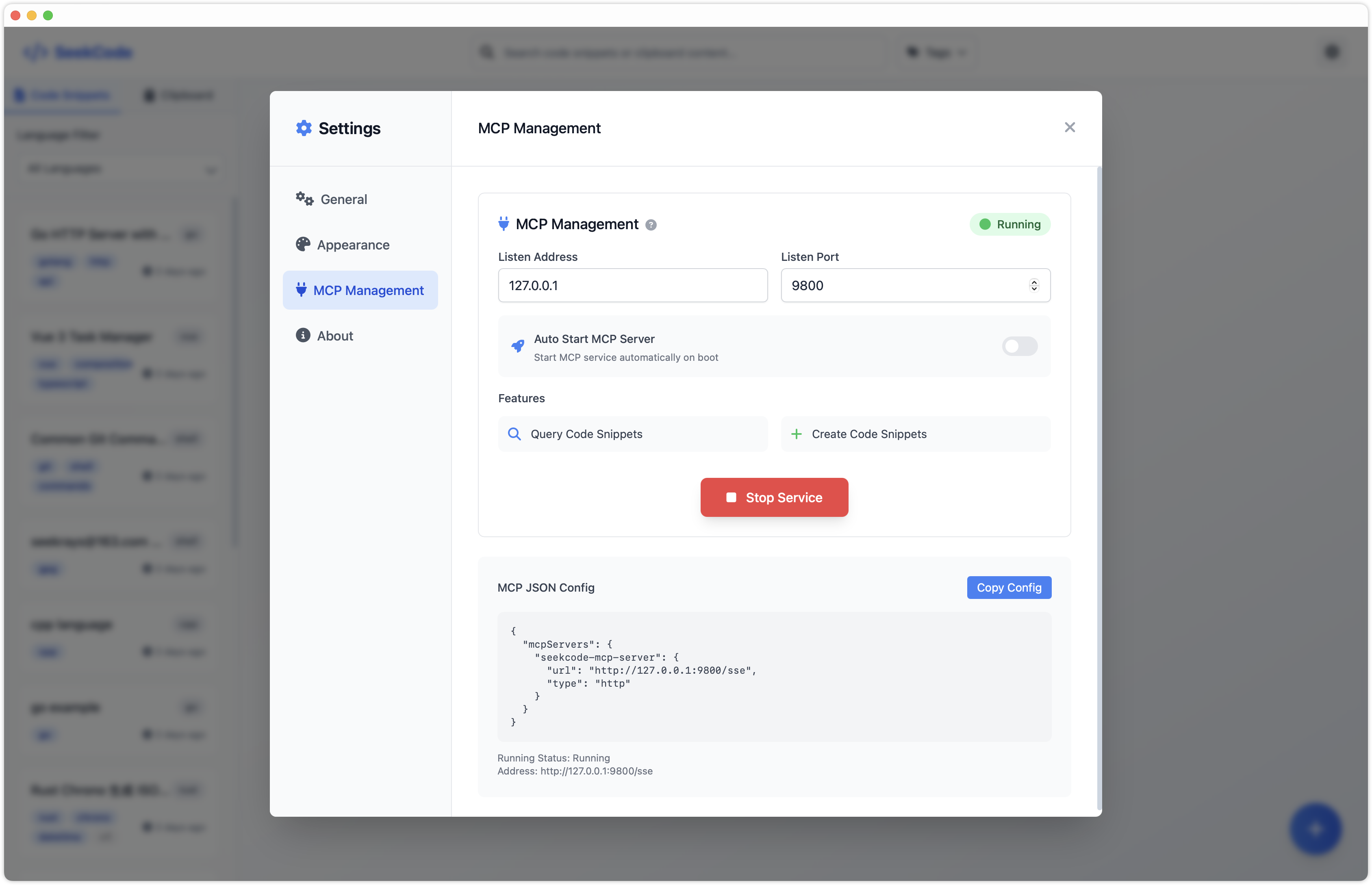 SeekCode is a modern desktop app for code management. It combines efficient code snippet organization with clipboard management, featuring tag-based search, syntax highlighting, and seamless clipboard-to-snippet conversion. It also ships with a built-in MCP server, enabling AI assistants and compatible tools to securely access and automate your snippets and clipboard via the Model Context Protocol (MCP).
