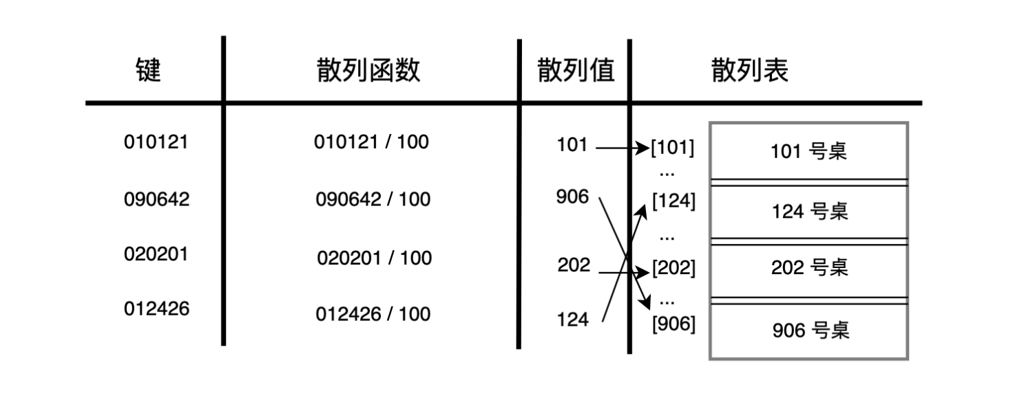 散列函数就提供了这种解决方案,10w 是多,但如果我们除以 100 喃,那就 0~999,这就很好找了,也不需要那么多桌子了。