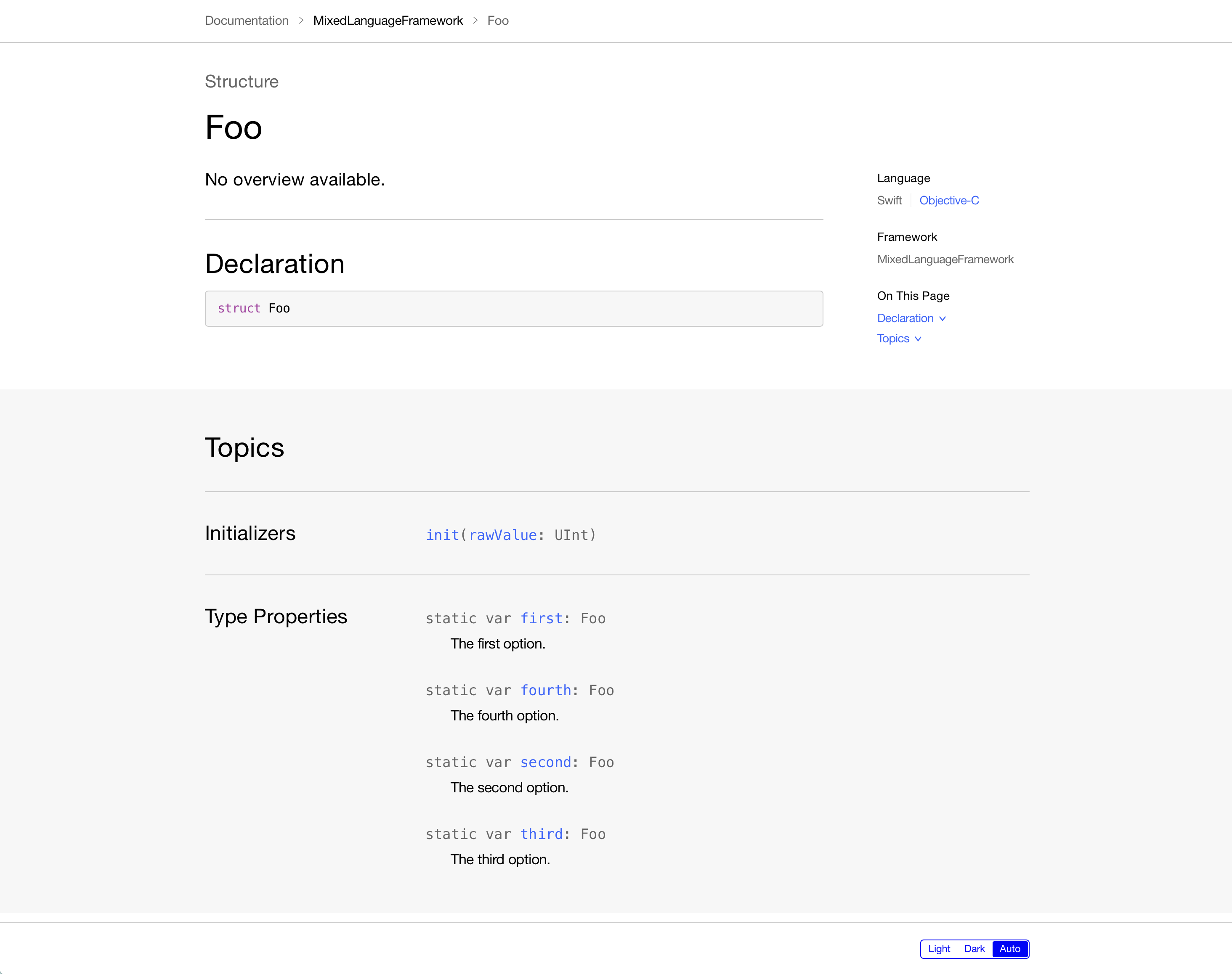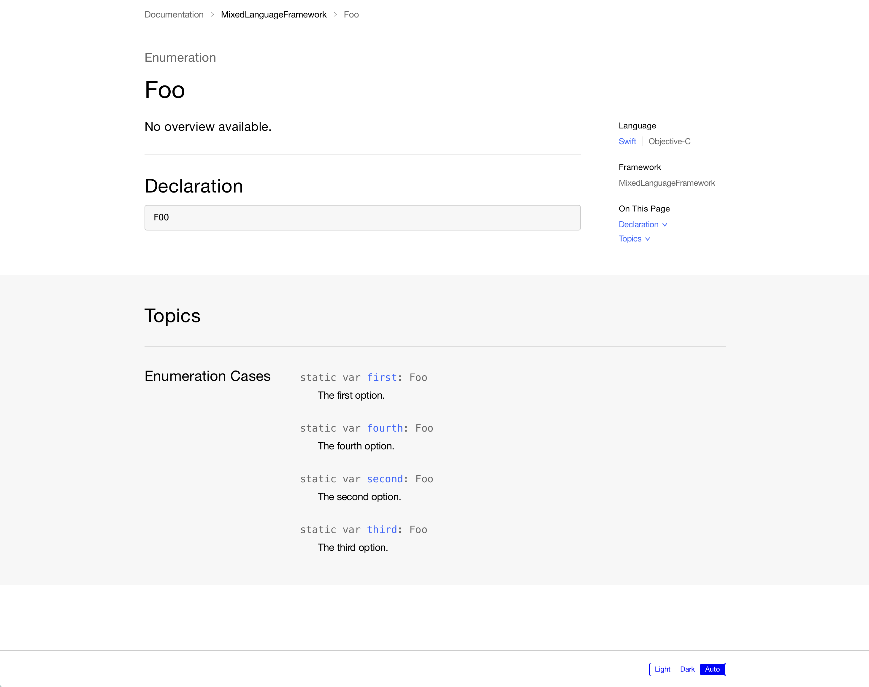 Tests/SwiftDocCTests/Test\ Bundles/MixedLanguageFramework.doccand confirm that output is expected.Steps: