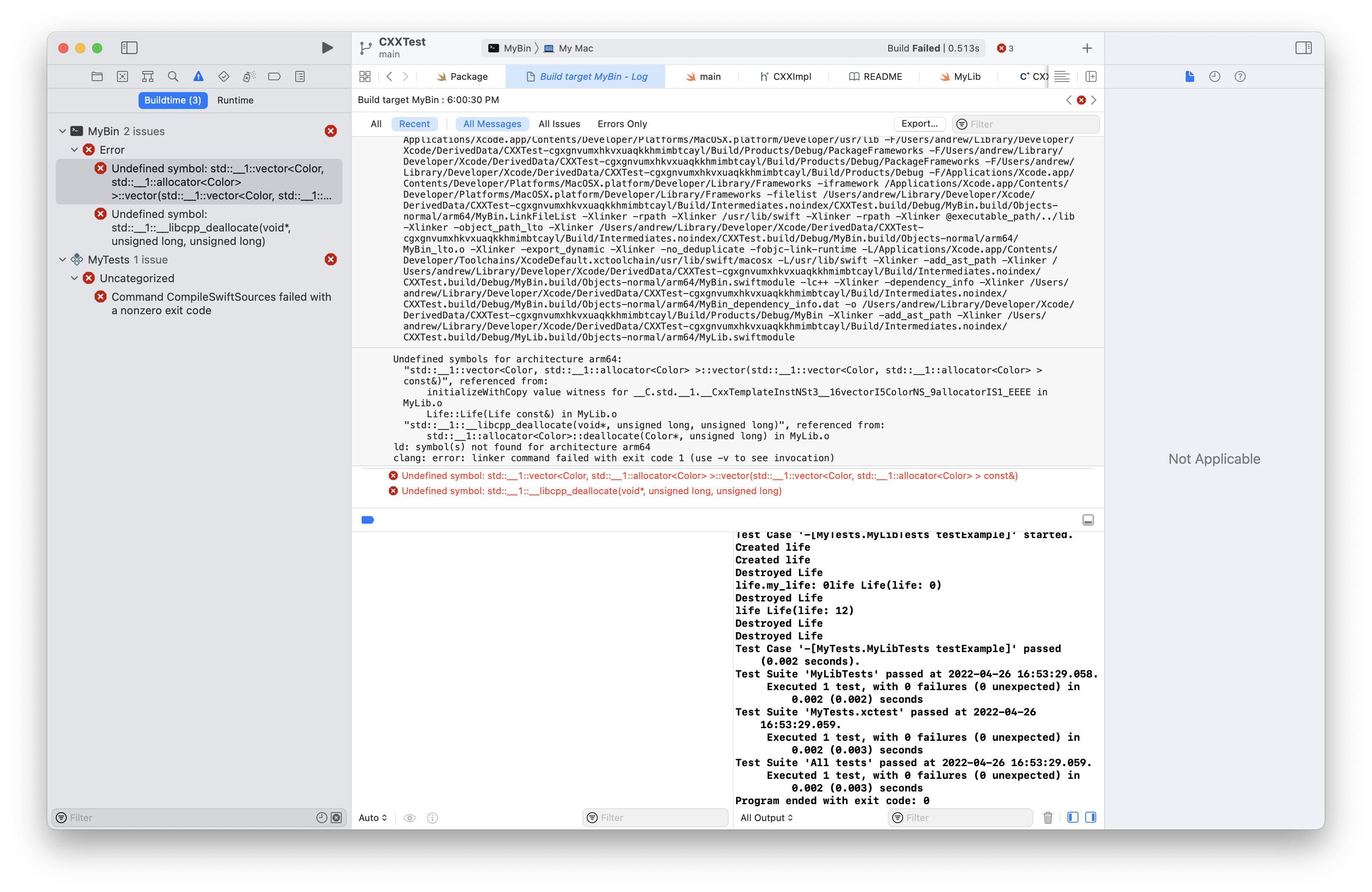 When embedding an std::vector in the type from C++, binaries and test targets do not link correctly when linking against the Swift module that depends on the C++ target.