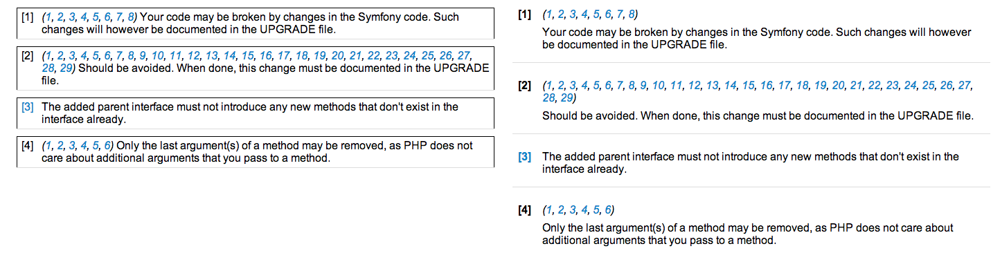 @wouterj @webmozart here it is the before/after comparison of the style of the footnotes. Please, tell me anything else that you'd like to change in this proposal and we'll see it in production soon: |