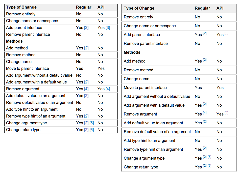 … text (webmozart) This PR was merged into the 2.1 branch. Discussion ---------- [Review] Added detailed Backwards Compatibility Promise text I created a detailed text about which parts of the Symfony code are covered by our BC promise. The goals are to: * tell our users which parts exactly are safe to use * tell our contributors which changes they are allowed to do I'll continue working on the individual rules of allowed changes. Nevertheless, let me hear your feedback. ##### Update (2014/01/10) The draft is ready for review now. Commits ------- 0717192 Removed useless line break ce58ee9 Added rules for adding parent interfaces and moving methods/properties to parent interfaces/classes be2251c Implemented @fabpot's comments 90c4de6 Mentioned Semantic Versioning in the introduction 2320906 Extracted duplicated text into _api_tagging.rst.inc bdd3c03 Implemented changes suggested by @wouterj fd1d912 Typo 11bb879 Grammar 25443c0 Improved table formatting e11335f Improved the wording of the "Using Symfony" section 4868452 Added prose about the difference between regular/API classes/interfaces 8c6c7bf Simplified usage description 6d9edf1 Improved wording: Changed "safe" to "guaranteed" ef1f021 Added note about test classes 5a160c5 Added note about deprecated interfaces/classes 69768dd Improved wording: use -> call, access 0c6420f Added information about changing parameter types 6501a35 Added information about changing return types that are classes or interfaces dfb3e8b Improved wording be76644 Added information about internal classes and interfaces af3a645 Added note about requesting `@api` tags dcbe79a Improved wording efd3911 Added that adding custom properties is not safe 00c6ebe Fixed safety statements 54fd836 Language improvements db76288 Fixed headings c6e850d Language fixes 4c5a55d Rearranged page to have different sections for different user bases 502ed95 Added: Some breaking changes to unsafe operations are documented in the UPGRADE file 31ab2db Improved wording a3ad08c Removed most of the "cannot" statements which are repeated in the tables now 345410c Rearranged safe operations to make more sense afadaab Changed: The last parameters of a method may be removed 44ecf16 Fixed: No parameters must be added (ever) to API class methods 0e925cb Added tables with safe operations 79ca9f7 Added information about type compatibility dacd7ce Rearranged rules to be more easily understandable 7320ed0 Updated BC promise to be valid as of Symfony 2.3 840073c Added detailed BC promise text