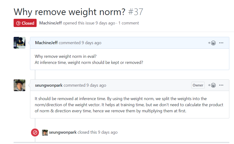 I read their pytorch code and I found that they remove weight norm at inference time. What's more, I have pulled an issue in that project.