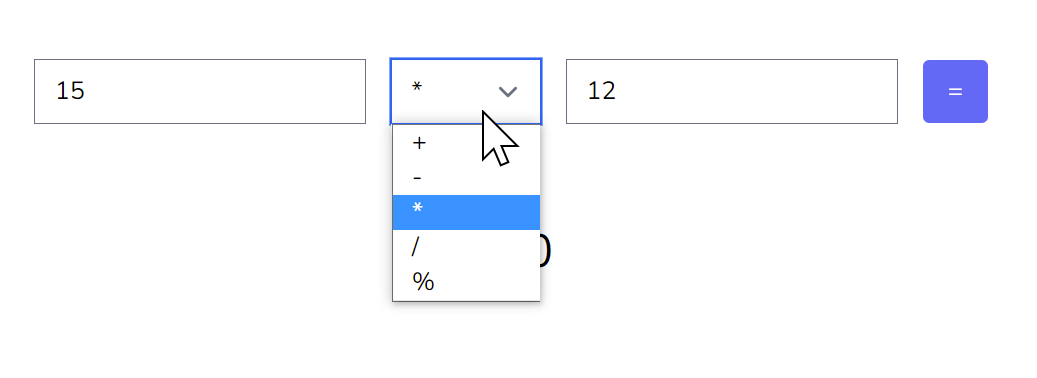 Very simple Calculator with with +, -, *, /, % operations. It has two inputs and one dropdown for operation and = button to calculate result.