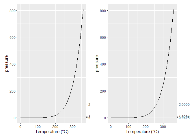p1 | p2Though it isn't identical w.r.t labels yet. p1 <- p + scale_y_continuous(sec.axis = sec_axis(log10))
